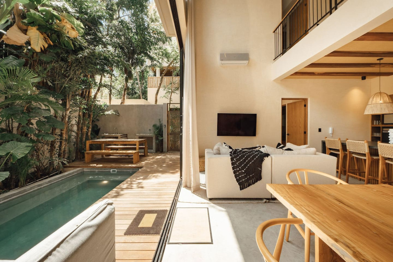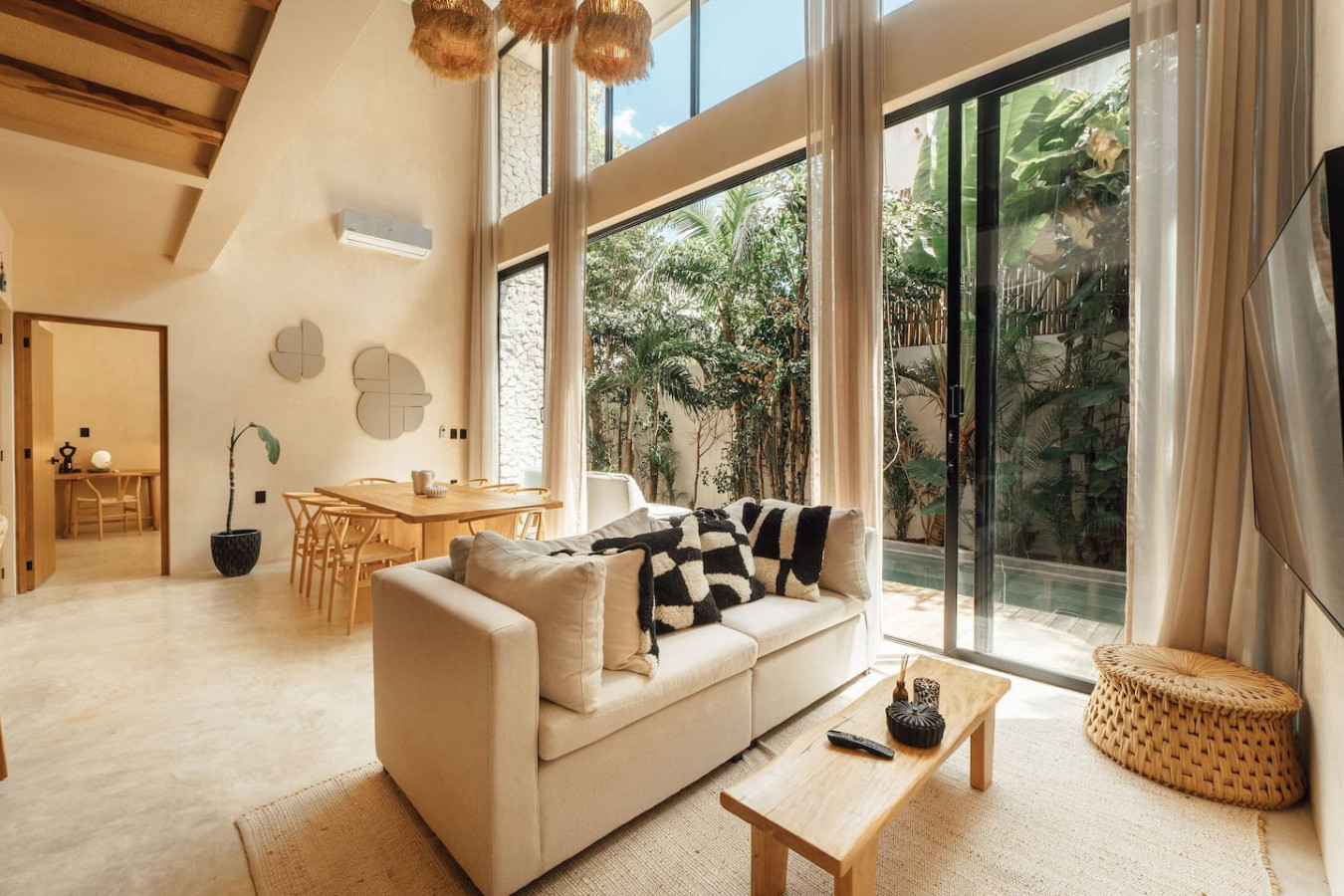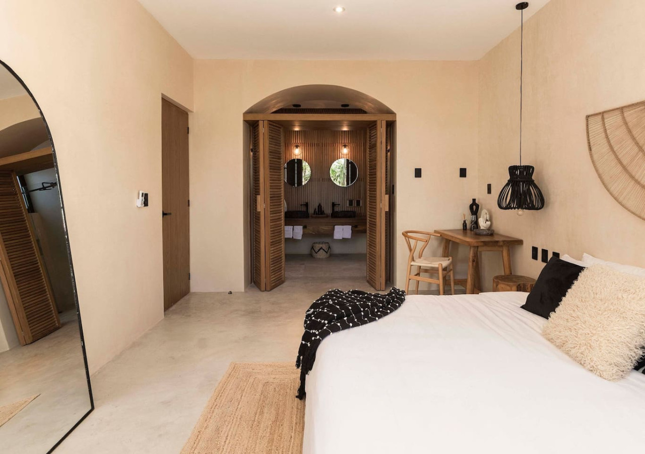 / nightWelcome to Villa 1, the crown jewel of Satori Tulum. This expansive 5-bedroom villa, with 4 ensuite bathrooms and an additional bedroom, offers a sanctuary of modern sophistication. The villa boasts a spacious ground-floor pool surrounded by lush greenery, providing a serene setting for relaxation or entertaining. On the rooftop, a private plunge pool, expansive lounge create the ultimate space for soaking in the beauty of your surroundings. This expansive 5-bedroom villa, with 4 ensuite bathrooms and an additional bedroom boasts a spacious ground-floor pool surrounded by lush greenery, providing a serene setting for relaxation or entertaining. On the rooftop, a private plunge pool, expansive lounge create the ultimate space for soaking in the beauty of your surroundings. Inside, the double-height living room is a statement of grandeur, flooding the space with natural light and enhancing the villa’s open, airy design. Ideal for families or groups of friends, Villa 1 comfortably accommodates up to 9 guests in style and comfort. The interiors feature a fully equipped kitchen, premium appliances, dining table and carefully curated furnishings that blend wabi-sabi luxury with natural inspiration. For your convenience, enjoy access to chef services, a concierge, and additional bespoke services to elevate your stay (available for a fee). Whether you’re lounging by the pool, savoring a rooftop sunset, or enjoying quality time with loved ones, Villa 1 offers a truly extraordinary experience. This is more than a villa—it’s your private oasis in the heart of Tulum’s lush paradise. Arriving at Your Tulum Escape: We want your arrival to be as seamless as possible. You’ll find convenient parking available directly in front of the condo. We recommend you download in advance the directions and the internet password for the common areas, phone service in the area could not be available. Check-in: 4:00 PM Check-out: 11:00 AM Your Well-being is Our Priority: At Satori, we value communication with our guests and look forward to meeting you. We will be available at the property from 9:00 a.m. to 6:00 p.m. to provide you with the best service. We'll be available via phone and text message. In case of an emergency outside of these hours, please contact any member of our staff or the security guard, who will be ready to assist you. Relaxed among nature It is advisable to rent a car, or motorcycle for easy access to the beach and town. Bikes rented on site. Welcome to Satori Tulum, an exclusive sanctuary nestled in the heart of Tulum’s lush jungle. Here, luxury seamlessly blends with nature, offering an unparalleled escape where architectural elegance, premium natural materials, and verdant greenery converge to create a truly inspiring retreat. Immerse yourself in an Insta-worthy oasis featuring two stunning main pools, meticulously curated spaces, and a tranquil ambiance that invites relaxation and reconnection. Every detail at Satori Tulum has been designed to deliver a sense of harmony, making it the perfect setting for your dream getaway. Conveniently located just a 7-minute drive from Tulum’s vibrant town center and its world-famous beaches, Satori Tulum offers both accessibility and seclusion. To fully enjoy the best of Tulum and its surroundings, we highly recommend having a car during your stay. This will allow you to explore the stunning cenotes, Mayan ruins, and hidden gems at your own pace. Please note: While our jungle haven offers serenity, ongoing construction nearby may produce light noise between 9:00 AM and 7:00 PM. Rest assured, the wealth of amenities and peaceful atmosphere at Satori Tulum will more than make up for it, ensuring a truly unforgettable experience