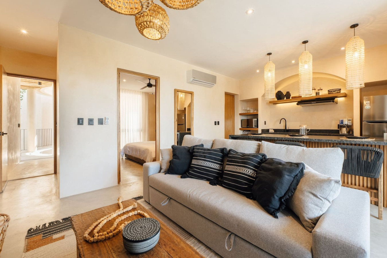 / nightMesmerizing views await you. From the freshness of your private balcony and pool, admire one of Tulum's most iconic pools, and watch glowing sunsets while relaxing with your loved ones. High-quality appliances, full kitchen, dedicated workspace for digital nomads, & plush king bed. Sofa bed sleeps 4. Washer/dryer. Luxury & functionality for an unforgettable Tulum escape. Our common area pools are the most iconic in all Tulum. Chill out watching breathtaking sunsets. Experience the magic of Tulum at Satori, nestled in Region 15 just 6 minutes from the main avenue and 800m into the jungle, providing the perfect blend of tranquility and easy access to the action. Only 3.5 km away, dive into the vibrant hotel zone, with its numerous beach clubs lining the stunning Caribbean coast. The route from Tulum Avenue offers convenient access to shops, restaurants, pharmacies, and a gas station. For a lively evening, the renowned Calle 7 in La Veleta, with its eclectic mix of restaurants, bars, and boutiques, is just a short trip away. Arriving at Your Tulum Escape: We want your arrival to be as seamless as possible. You’ll find convenient parking available directly in front of the condo. If you are arriving by taxi or private transfer, you can be dropped off right at the entrance, where our team will be waiting to warmly welcome you and show you around. Check-in: 3:00 PM to 5:00 PM. Our staff will be available to greet you and hand over the keys in person. After 6:00 PM: Check-in is done at the reception with the security guard. We will send all the instructions to access your accommodation. Housekeeping: Complimentary Housekeeping: Enjoy a free cleaning service every seven days of your stay. This includes tidying up the bathrooms and kitchen, making the beds, and cleaning the floors. Extra Cleaning: If you’d like a more thorough cleaning or more frequent service, just let your concierge know. (Additional fees apply and are subject to availability). Bedding & Towels: Linen Changes: For stays longer than seven days, fresh linens and towels will be provided during your complimentary cleaning. In-Unit Laundry: For your convenience, each unit has a washer and dryer. You can also request extra linen changes through your concierge for a small fee. Electricity: Power Supply Notes: Due to ongoing development in Tulum, occasional power outages may occur due to work by the CFE (Mexico's Federal Electricity Commission). These outages are sometimes announced in advance, but schedules can change. During the rainy and hurricane seasons, outages can be more frequent and last longer. What We Provide: We have flashlights and rechargeable fans available for your use. Electricity Usage: We’ll take a meter reading at check-in and check-out. Your reservation includes ___ kw/h per day. Usage beyond this will be charged at __ per kw/h. Internet Access: Wi-Fi Details: You’ll receive the Wi-Fi network name and password upon arrival. Tech Support: Please contact your concierge if you experience any issues with the internet. Possible Disruptions: Internet service may be affected during heavy rains and hurricanes. Water: Tap Water: The tap water is not suitable for drinking or cooking, but it’s perfectly safe for brushing your teeth and showering. Waste Disposal: Recycling & Trash: Each unit has separate bins for organic and inorganic waste. Trash Removal: Our housekeeping staff will empty the trash during your complimentary cleanings. There are also larger bins available for guests outside the building. Air Conditioning: Optimal AC Use: The ideal setting for the mini-split AC units in this area is 24°C (75°F). Maintenance Requests: Please report any issues with the AC immediately. Responsible Use: Please turn off the AC/heating when you leave the unit. Hot & Cold Water: Faucet Operation: In Mexico, turning the tap to the right is for cold water, and turning it to the left is for hot water. Hot Water Warm-Up: Please note that it may take a few minutes for the hot water to come through. Your Well-being is Our Priority: At Satori, we value communication with our guests and look forward to meeting you. We will be available at the property from 9:00 a.m. to 6:00 p.m. to provide you with the best service. For your convenience, you can also contact us via phone call or text message. In case of an emergency outside of these hours, please contact any member of our staff or the security guard, who will be ready to assist you. Relaxed among nature It is advisable to rent a car, or motorcycle for easy access to the beach and town. Bikes rented on site. Welcome to Satori Tulum, an exclusive sanctuary nestled in the heart of Tulum’s lush jungle. Here, luxury meets nature in perfect harmony, offering you an unparalleled getaway that blends refined architectural design, high-quality natural materials, and vibrant greenery. Immerse yourself in an Insta-worthy oasis featuring two spectacular main pools, thoughtfully curated spaces, and a serene ambiance designed to inspire relaxation and connection. While our location is a quick 7-minute drive from both Tulum’s vibrant town center and pristine beaches, the tranquil jungle setting ensures a peaceful retreat from the bustle. Please note that construction is ongoing nearby, with light noise possible between 9 am and 7 pm. However, the serenity of Satori Tulum and its wealth of amenities will undoubtedly make your stay memorable.